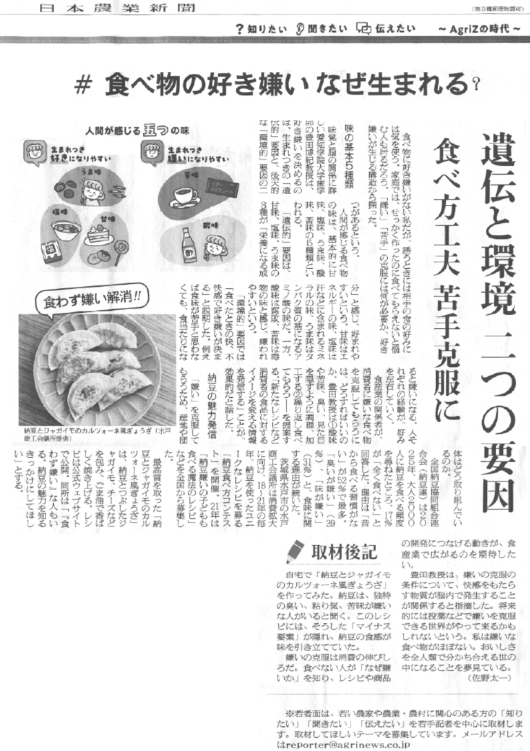 NEW 「日本農業新聞」掲載(1/19)歯学部 生理学講座 豊田博紀教授のコメントが掲載されました