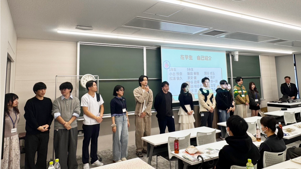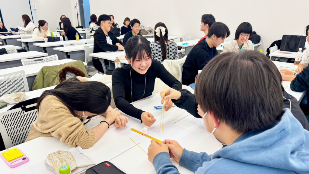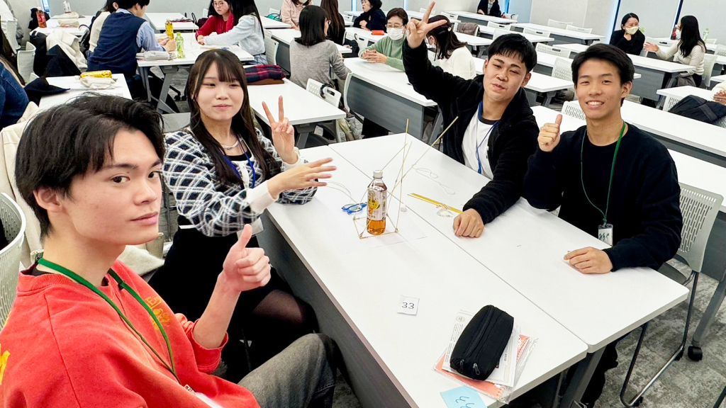 学部長、教務委員長、次年度1年生学年主任からのお話や在学生の自己紹介の後は、2人1組で共通点をさがしながらお互いに自己紹介をしました。レクリエーションでは4人1組で「マシュマロチャレンジ」を行いました。相談しながら協力して行うので、「初めは緊張したけど、みんなと話せて良かった。協力してチャレンジするのが楽しかった。」「チームで協力して1つのことに集中できたので、とても良いイベントでした。」という感想が多くありました。